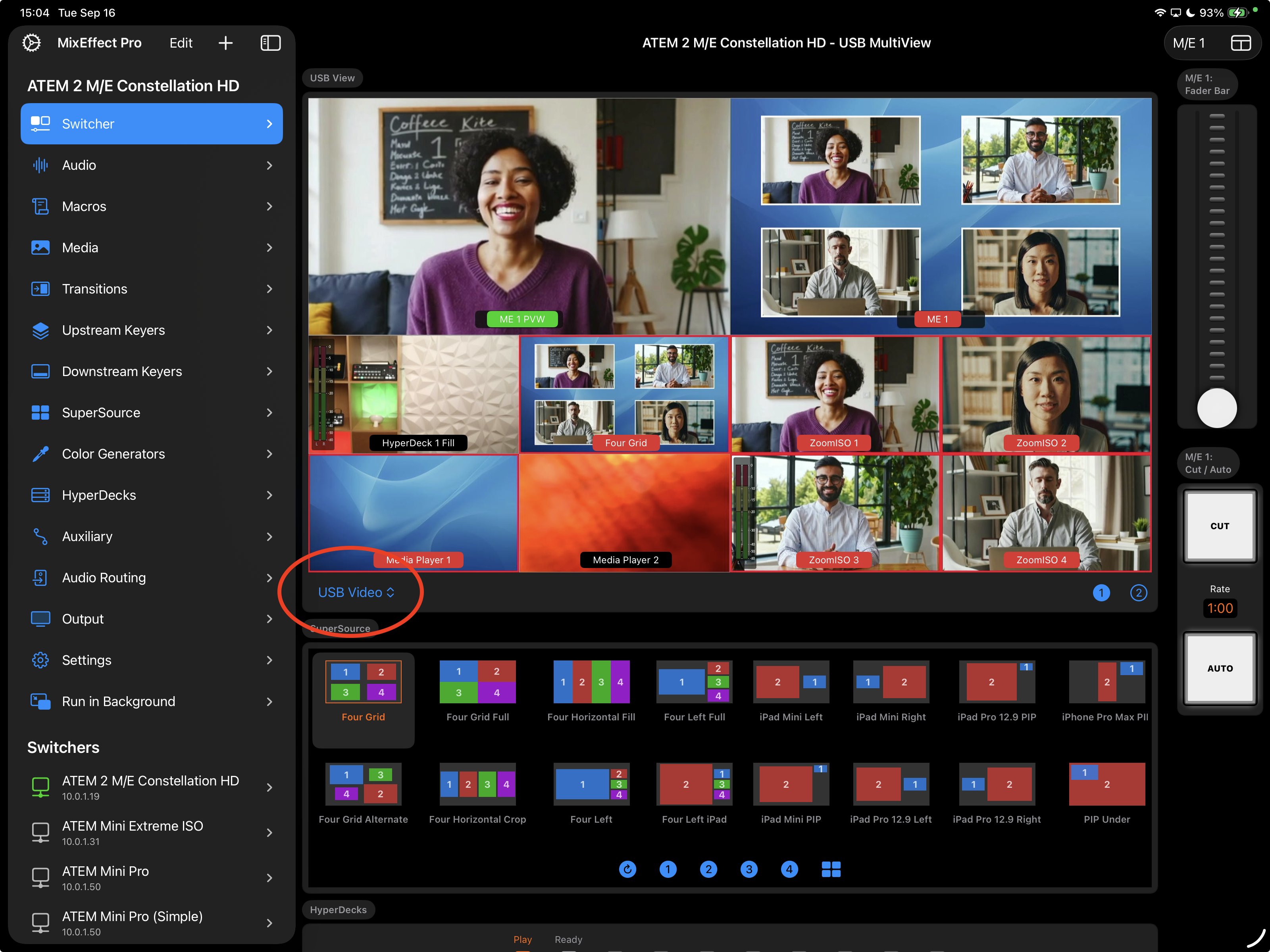 External cameras can now be used with MixEffect 2.1.0 and higher on macOS 14 and iPadOS 17. Add a [USB View](https://docs.mixeffect.app/configure/switcher-pages/panels-and-buttons/usb-view) switcher panel to your Switcher section to view the Program or Multiview output from your ATEM switcher directly in MixEffect. With the Multiview Overlay feature, you can even touch the video tiles to change inputs, switch SuperSource layouts, and more.