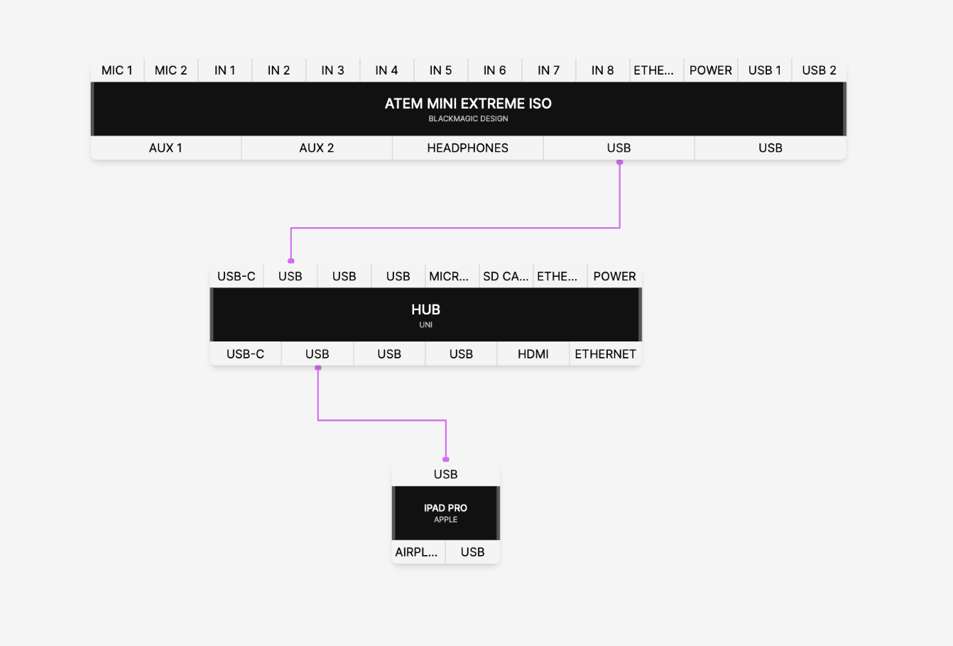 Here is the signal flow needed to output the Multiview from an ATEM Mini Extreme ISO into an iPad Pro over USB.