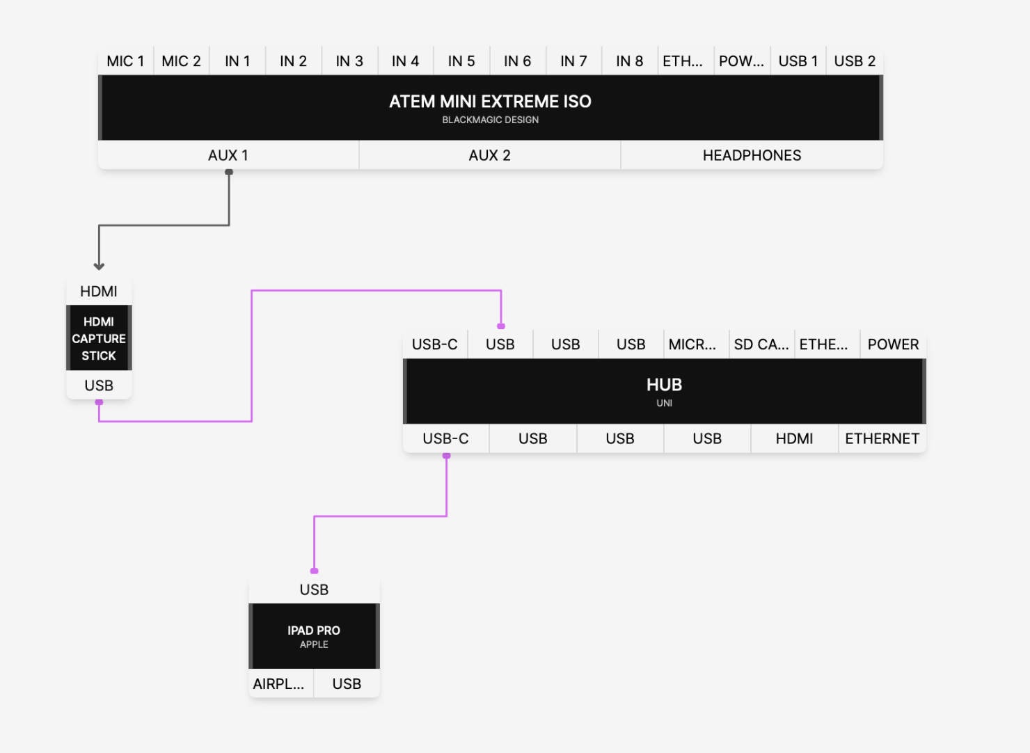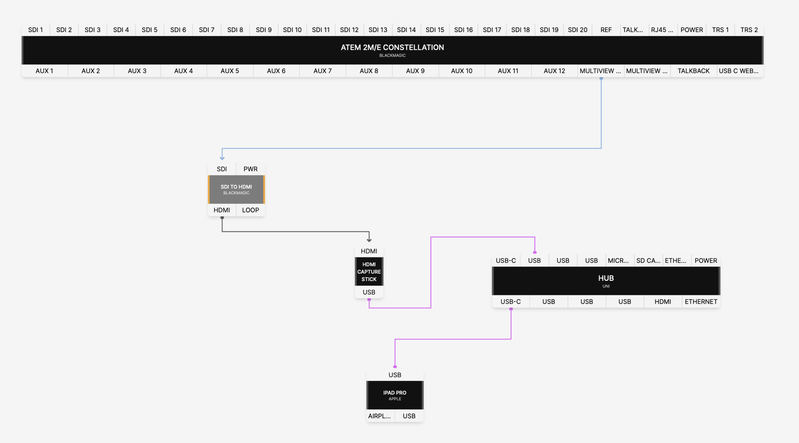 * ATEM -> Multiview 1 SDI -> Multiview to SDI to HDMI converter -> HDMI to USB adapter -> USB-C Hub -> iPad Pro