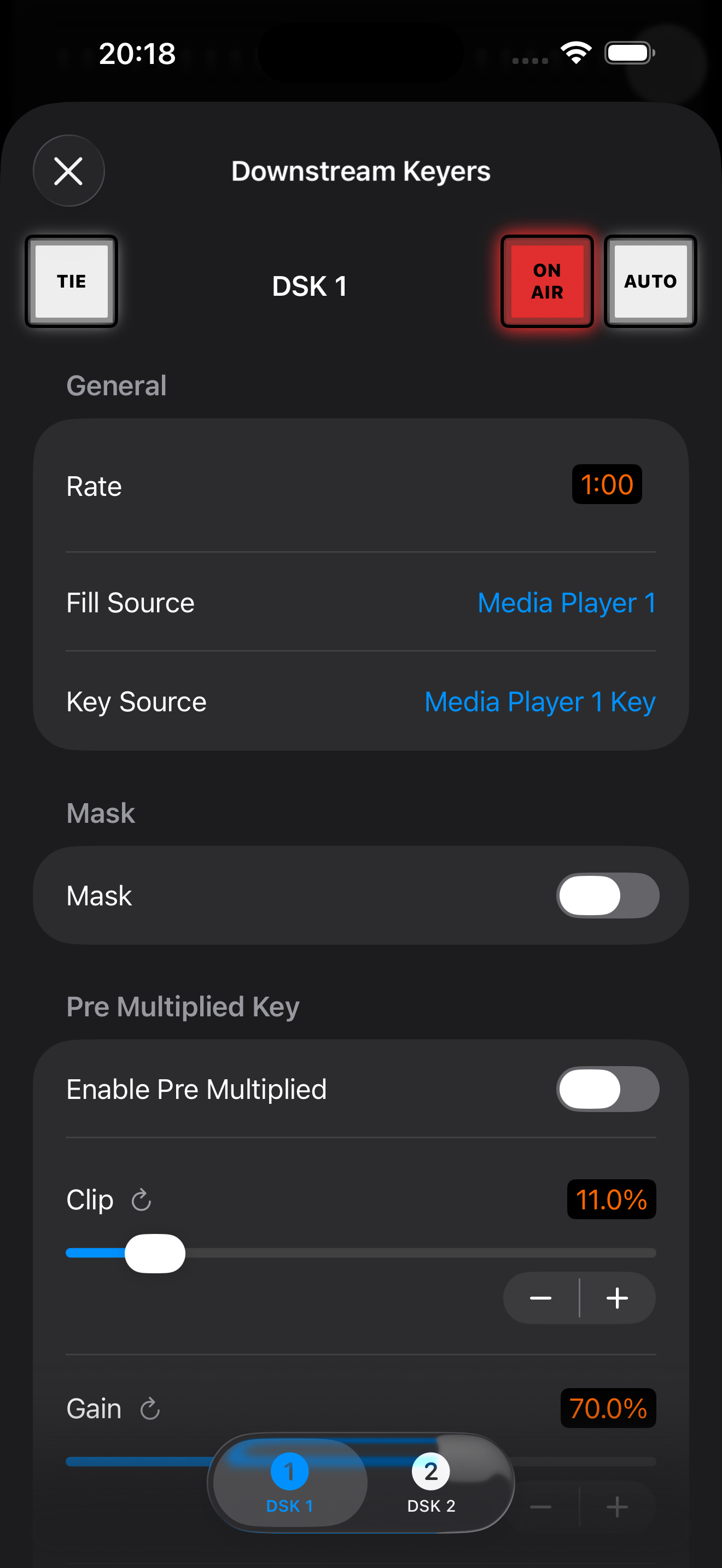 If you have an ATEM switcher that has multiple DSKs, a tab interface will appear at the bottom of the page allowing you to modify each DSK independently.