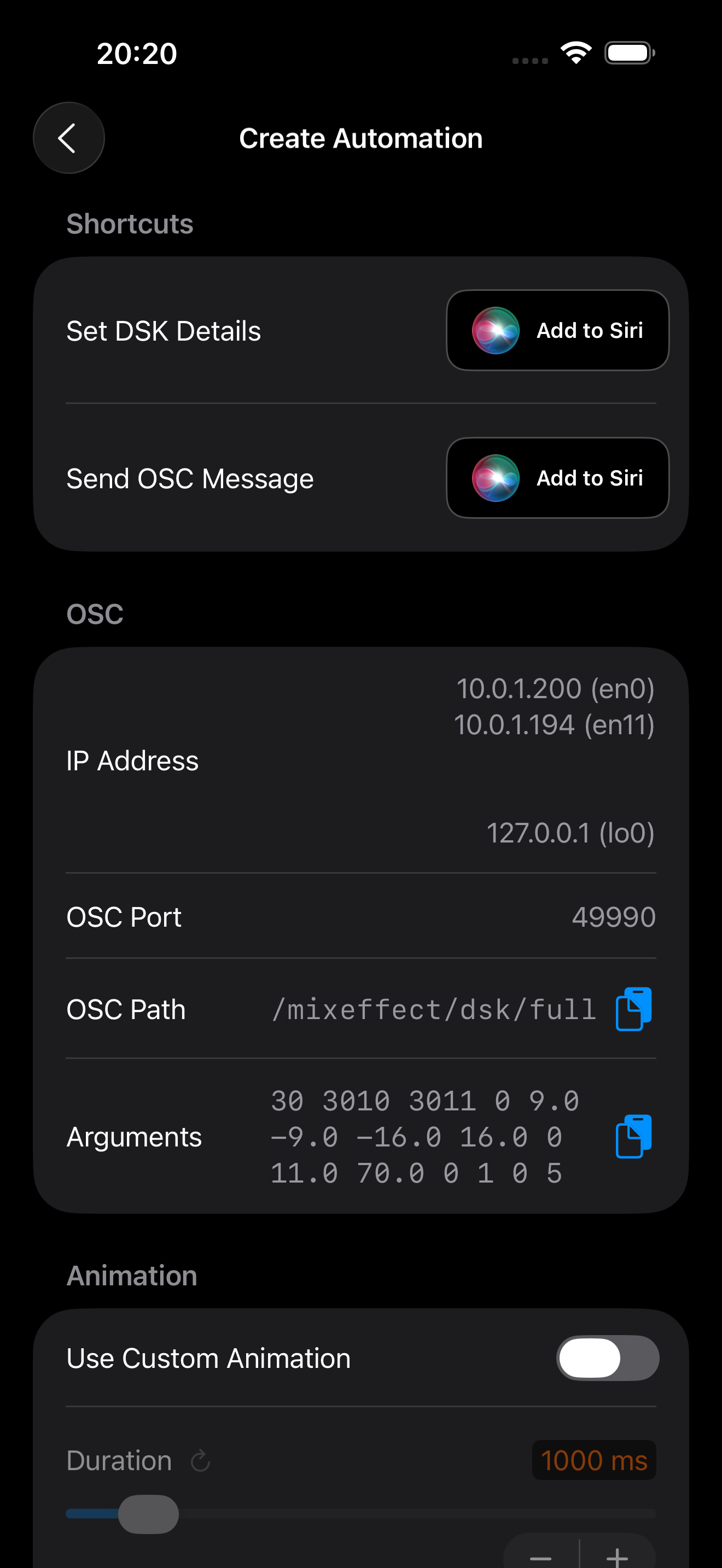 * **Send OSC Message**: Tapping the Add to Siri button will create a shortcut that uses the Send OSC Message to send a Set DSK Full message to MixEffect.