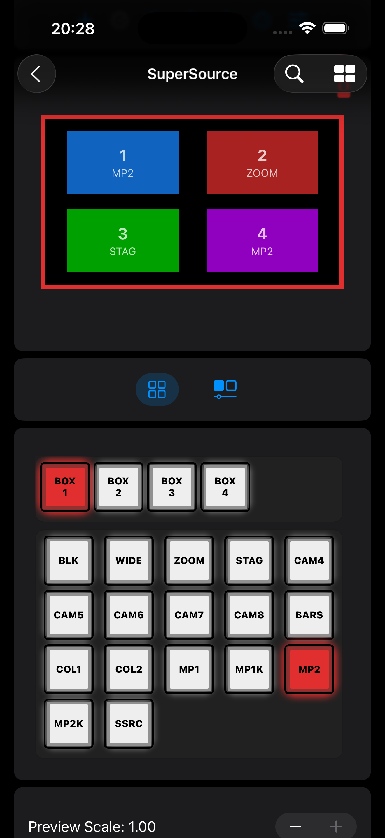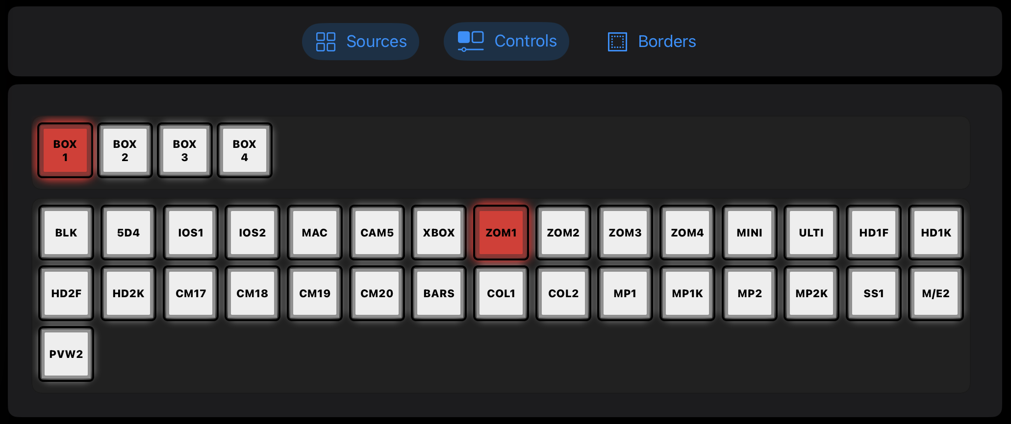 In MixEffect 2.2.0, there's a new way to toggle between Box Sources, Box Controls, and Box Borders editing panels. Tap on the button to reveal the editing panel. Note that Box Borders will only appear if the ATEM switcher MixEffect is currently connected to supports SuperSource Box Borders.