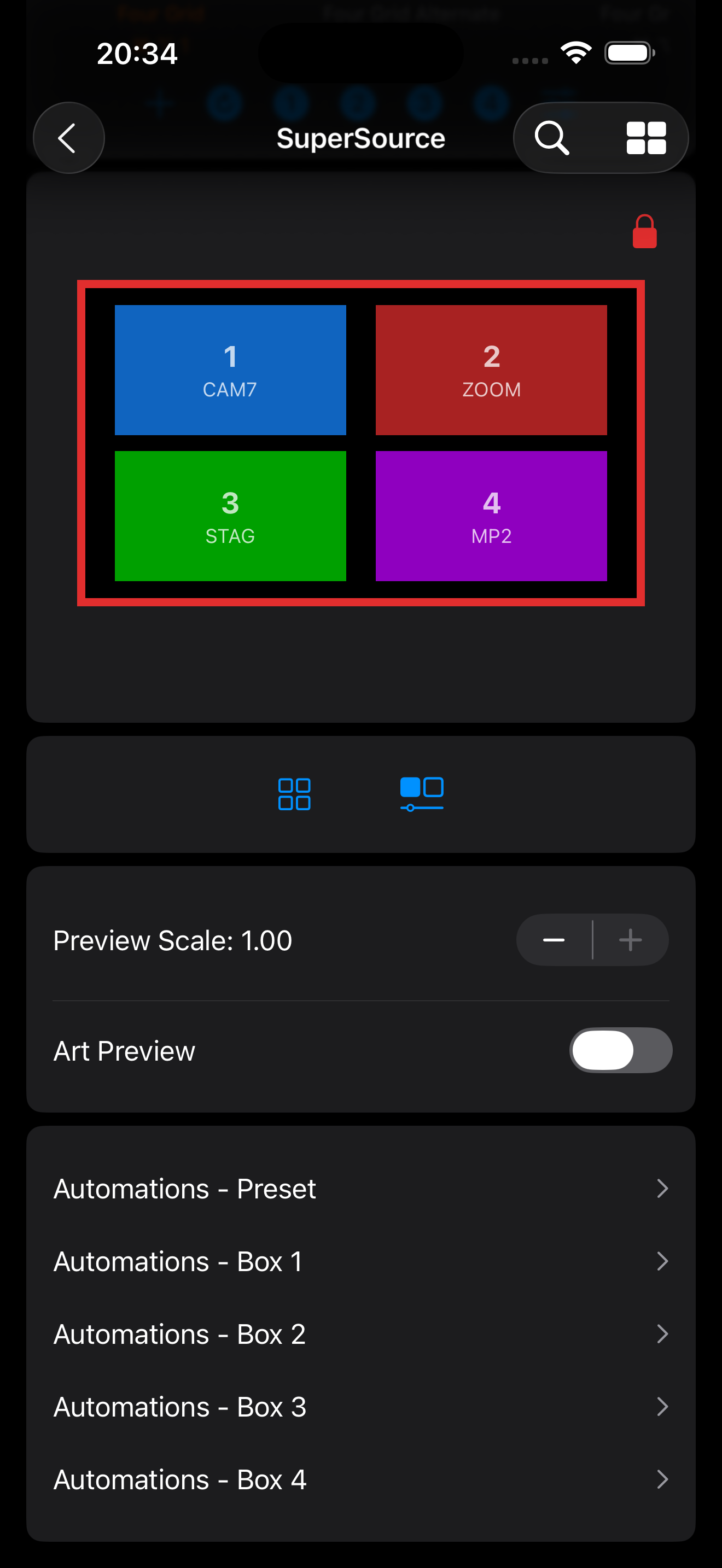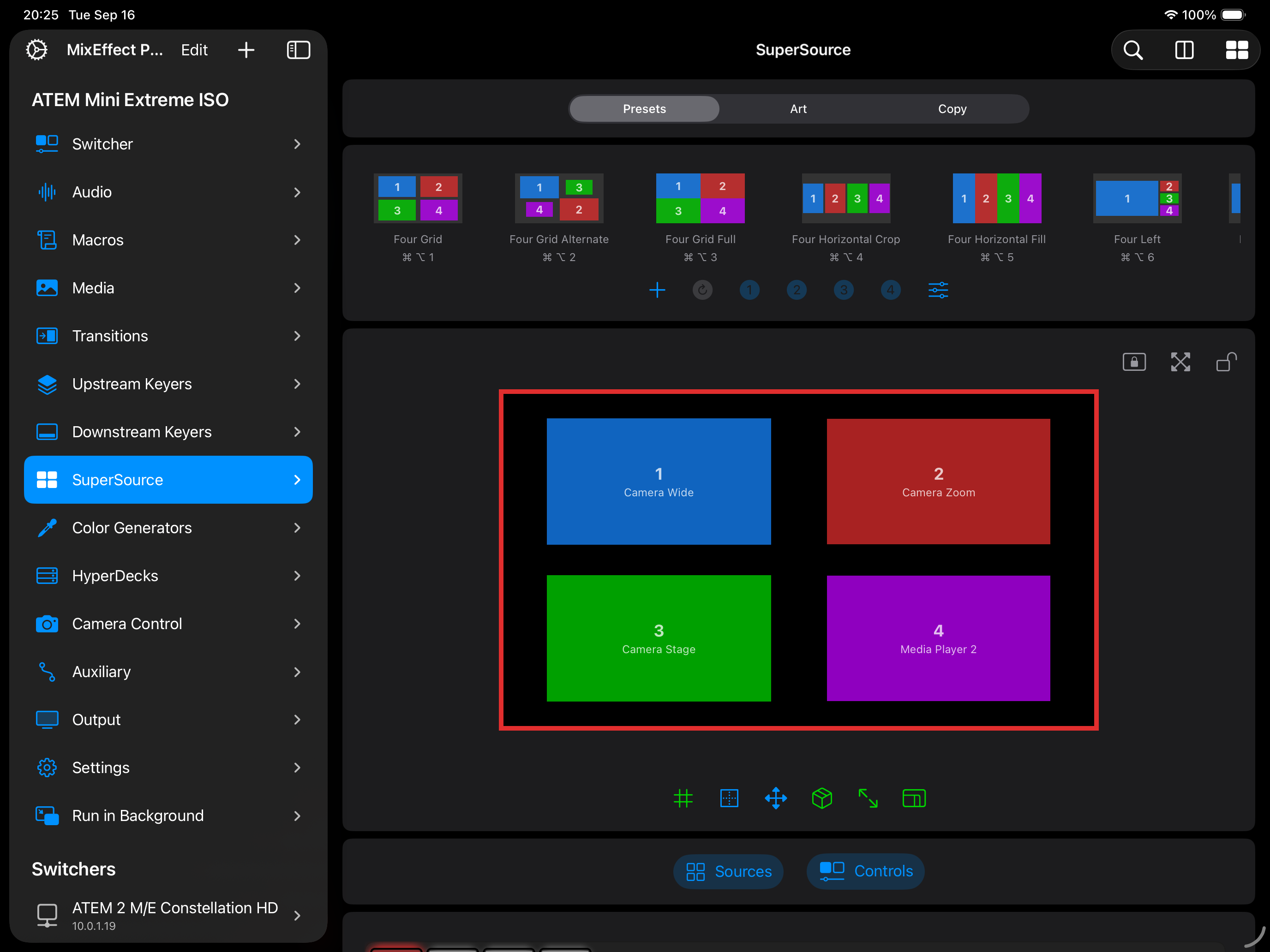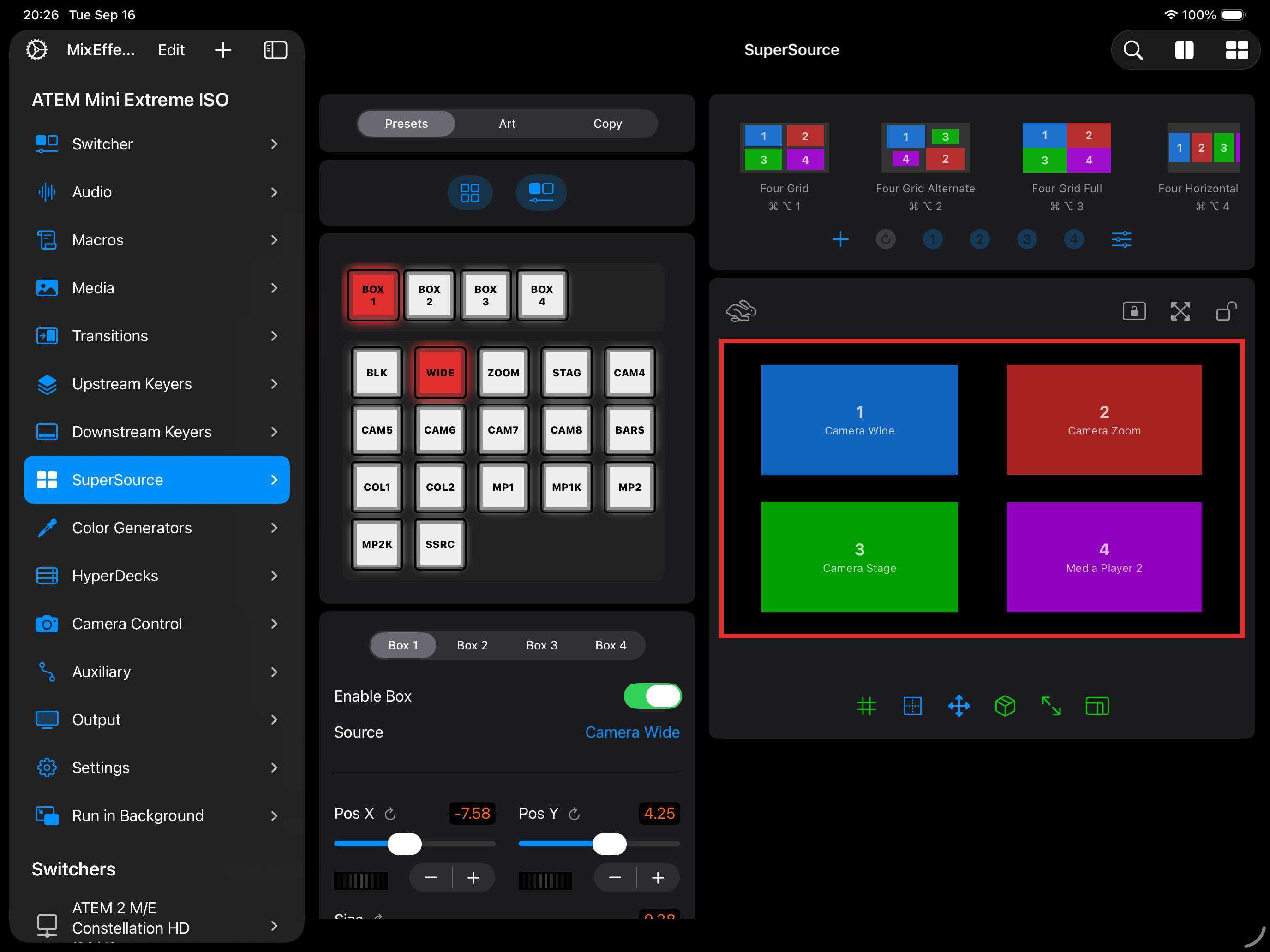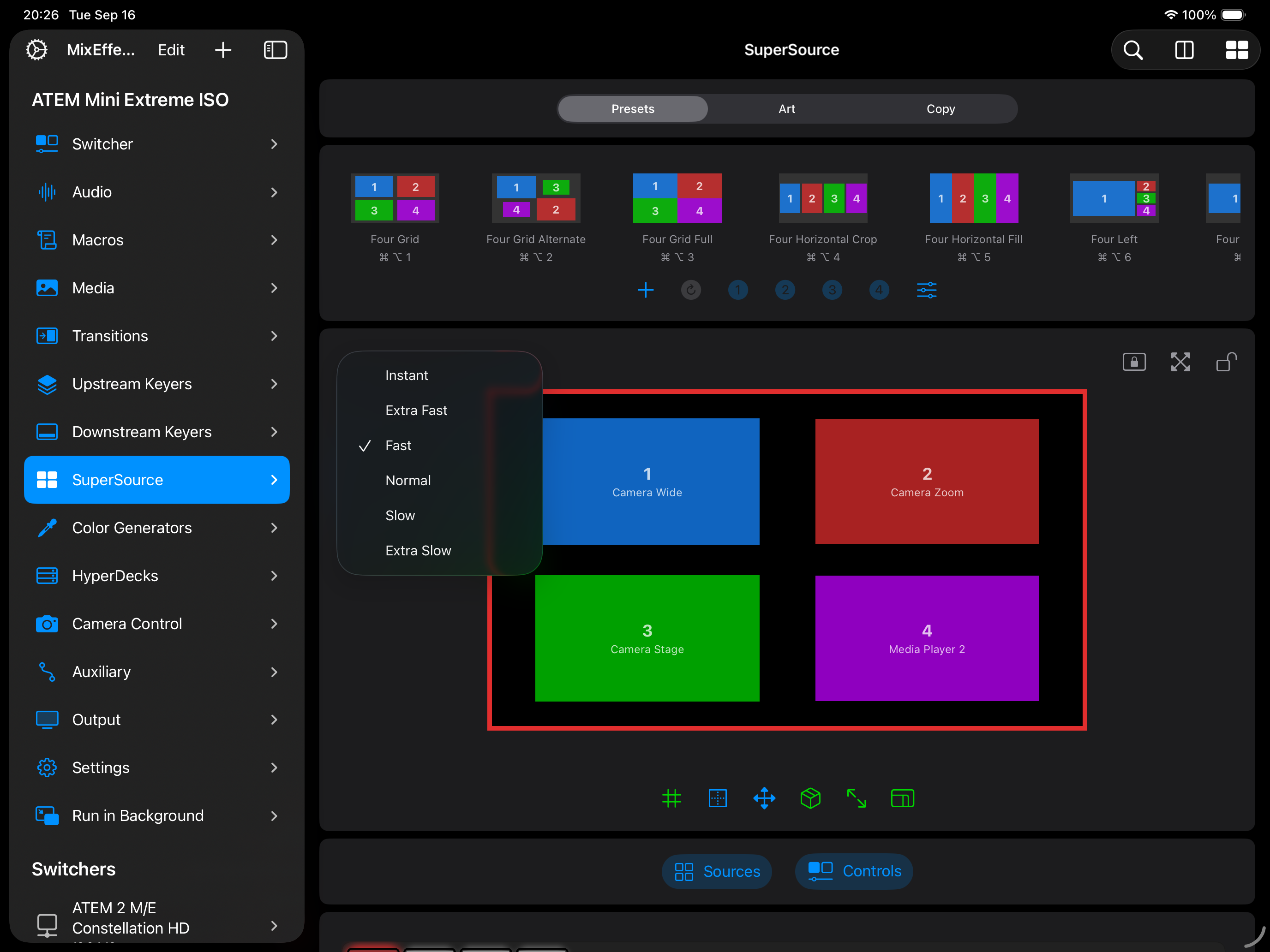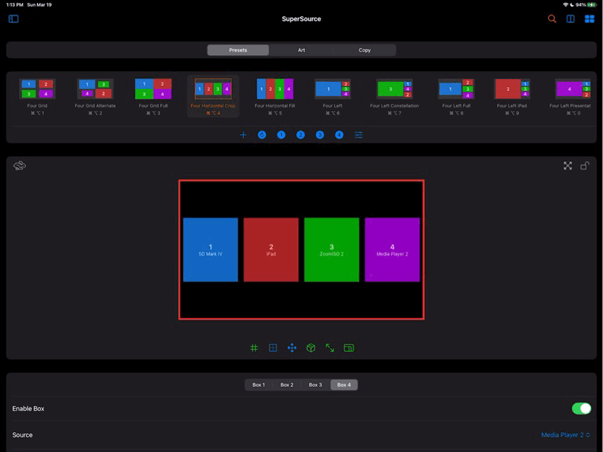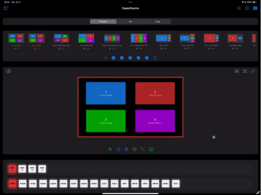 Command-4to perform this function on a hardware keyboard.Options Menu: Tap to display a menu allowing you to change the transition speed, transition style, the source for each box, controls for swapping box sources, and the sizes of the highlighted and non-highlighted boxes. You can also perform an Auto or Cut transition to and from the SuperSource.
