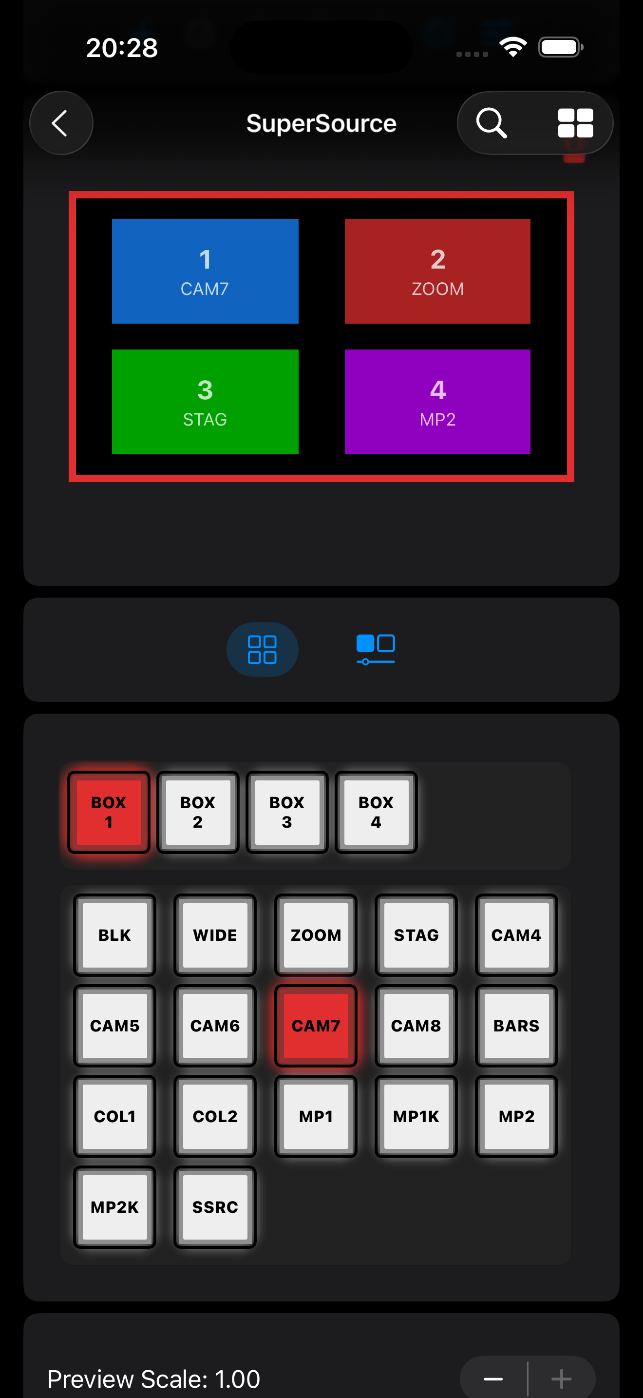Adjust the size of the SuperSource Visual Editor preview from 0.25 to 1.0.