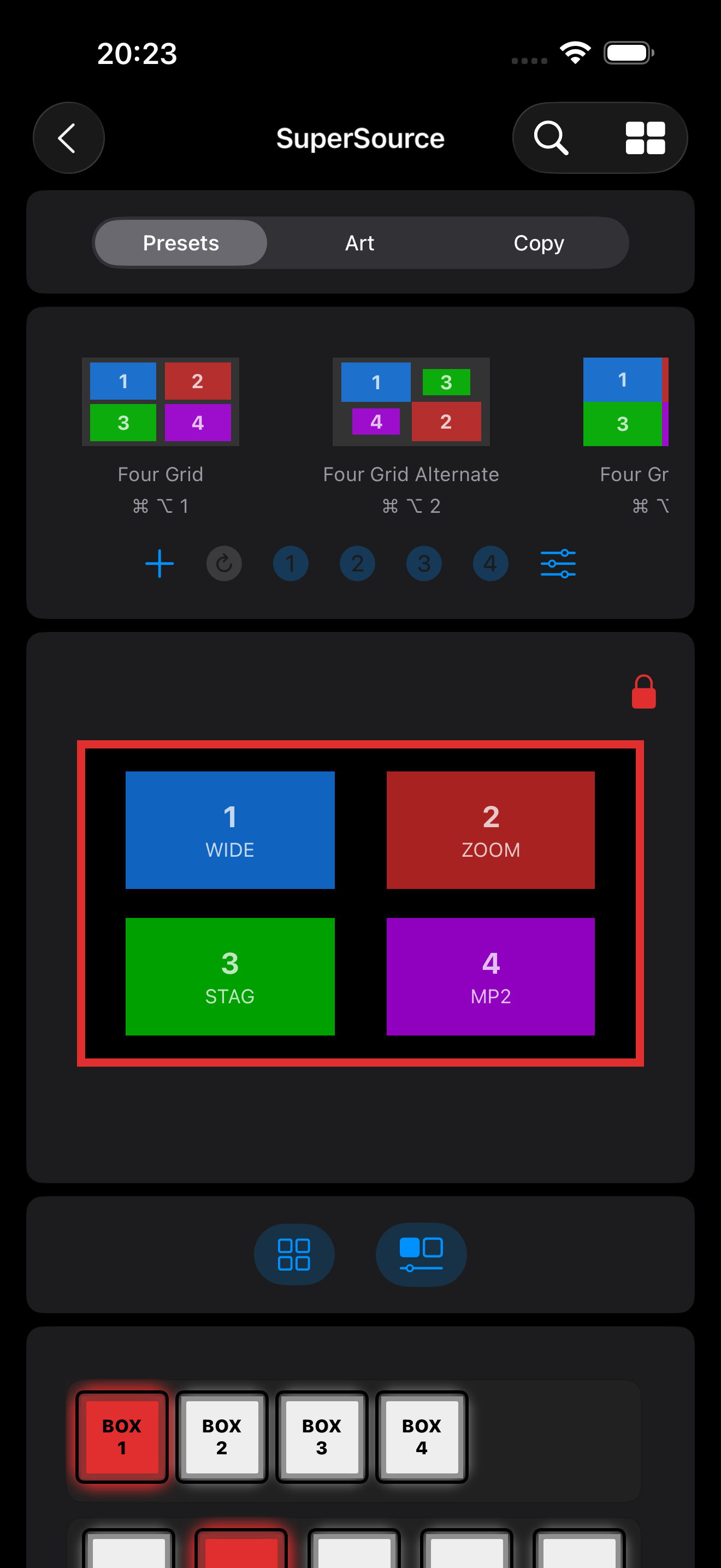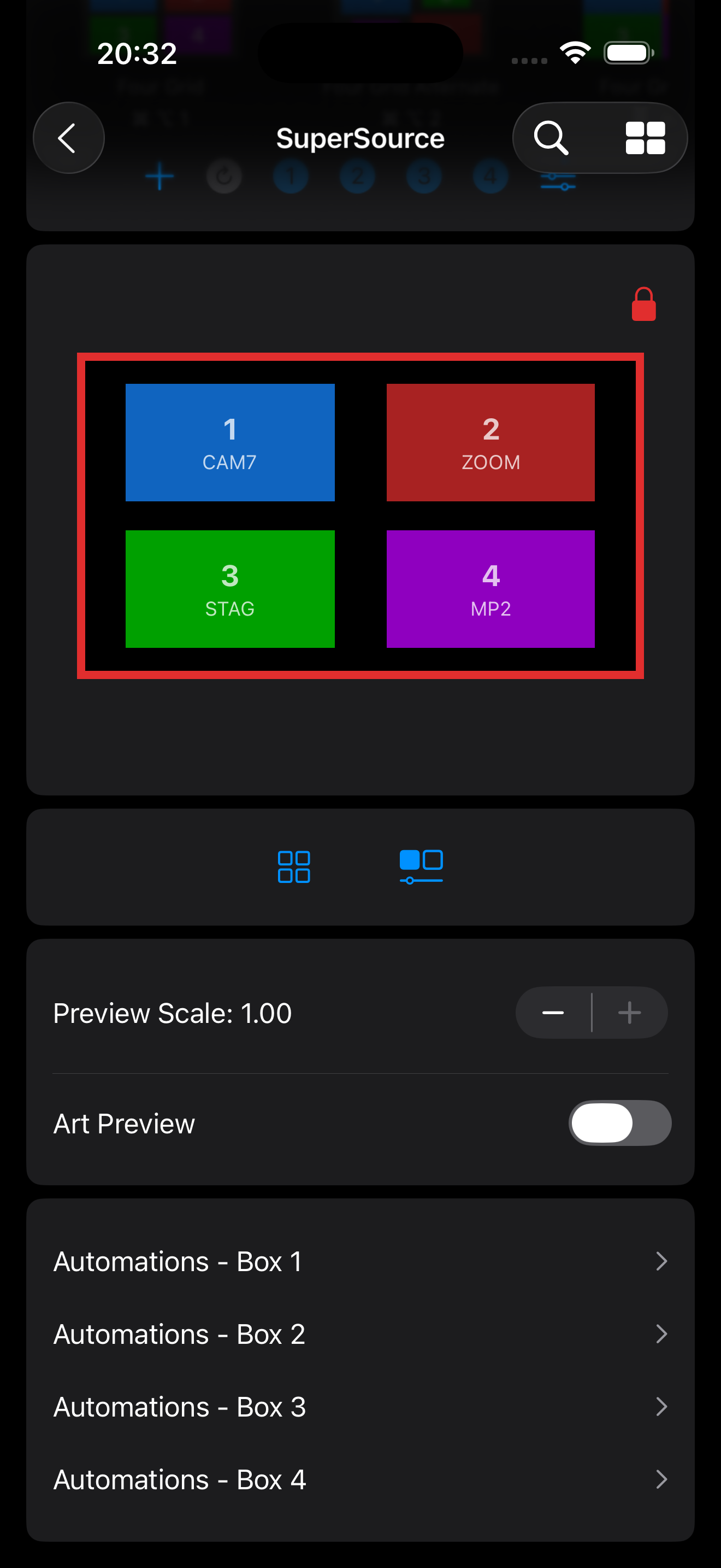 In the ATEM, box 1 will always be on top of box 2, followed by box 3, and box 4. When positioning boxes in the visual editor, you may get in a situation where boxes are stacked on top of each other and you want to reposition one that is underneath another box (i.e. box 2 underneath box 1). You can use the locked box menu to selectively lock or unlock boxes in the visual editor.