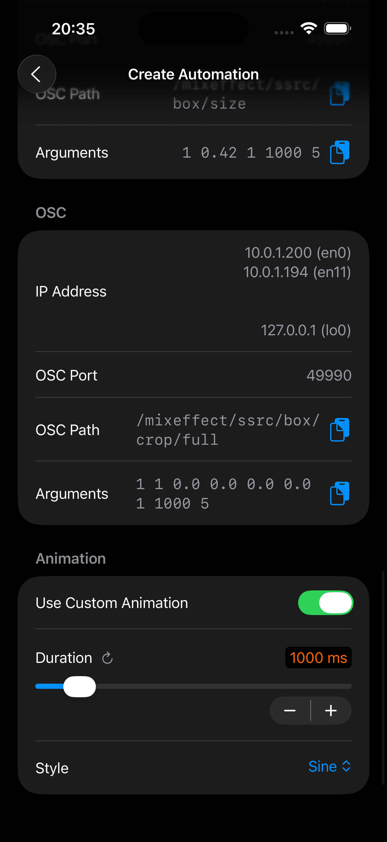 Within the Automation page, you can also configure a custom animation duration and style for the shortcut or OSC action.